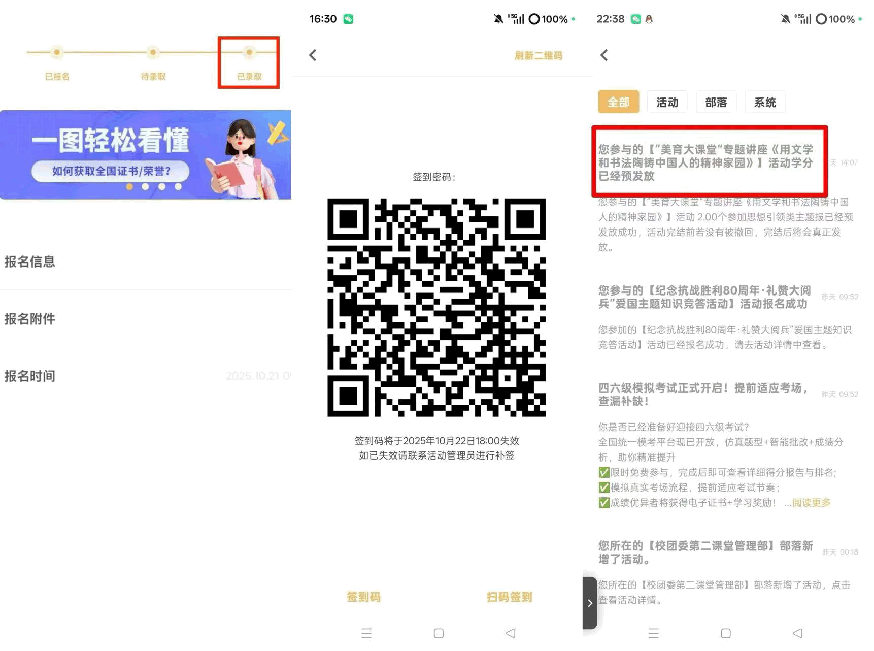 包含参加主题报告会、主题讲座(包括思想类学术讲座、知识科普类讲座等)、获得先进个人称号、班集体、团支部、寝室等优秀集体、参军入伍、“西部计划”、征文比赛、辩论赛、团校及青马培训等。