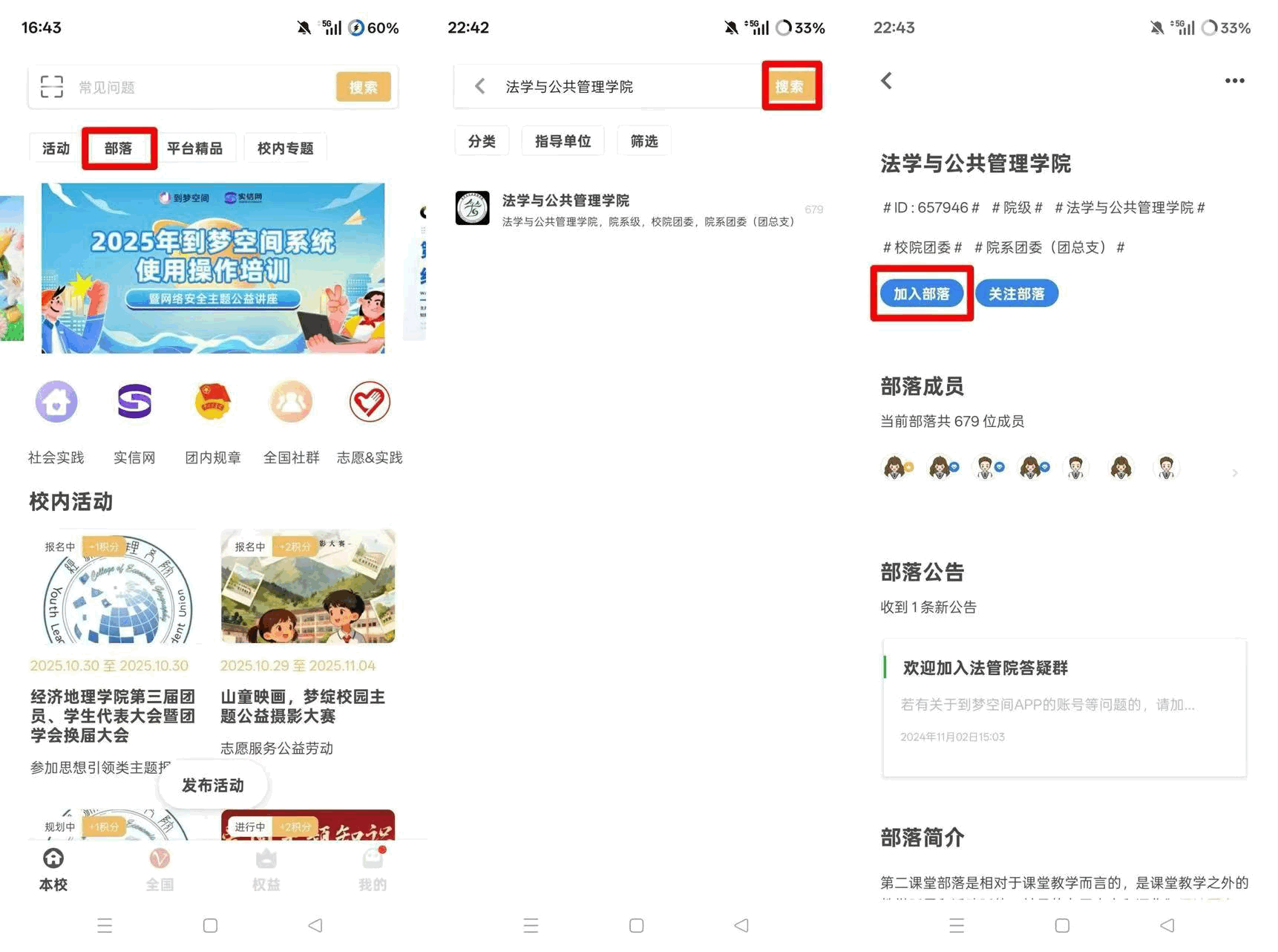 点击首页“部落”按钮,搜索自己所要加入的部落,点击加入部落。(注:部落负责人/管理员通过申请后即可加入部落。)