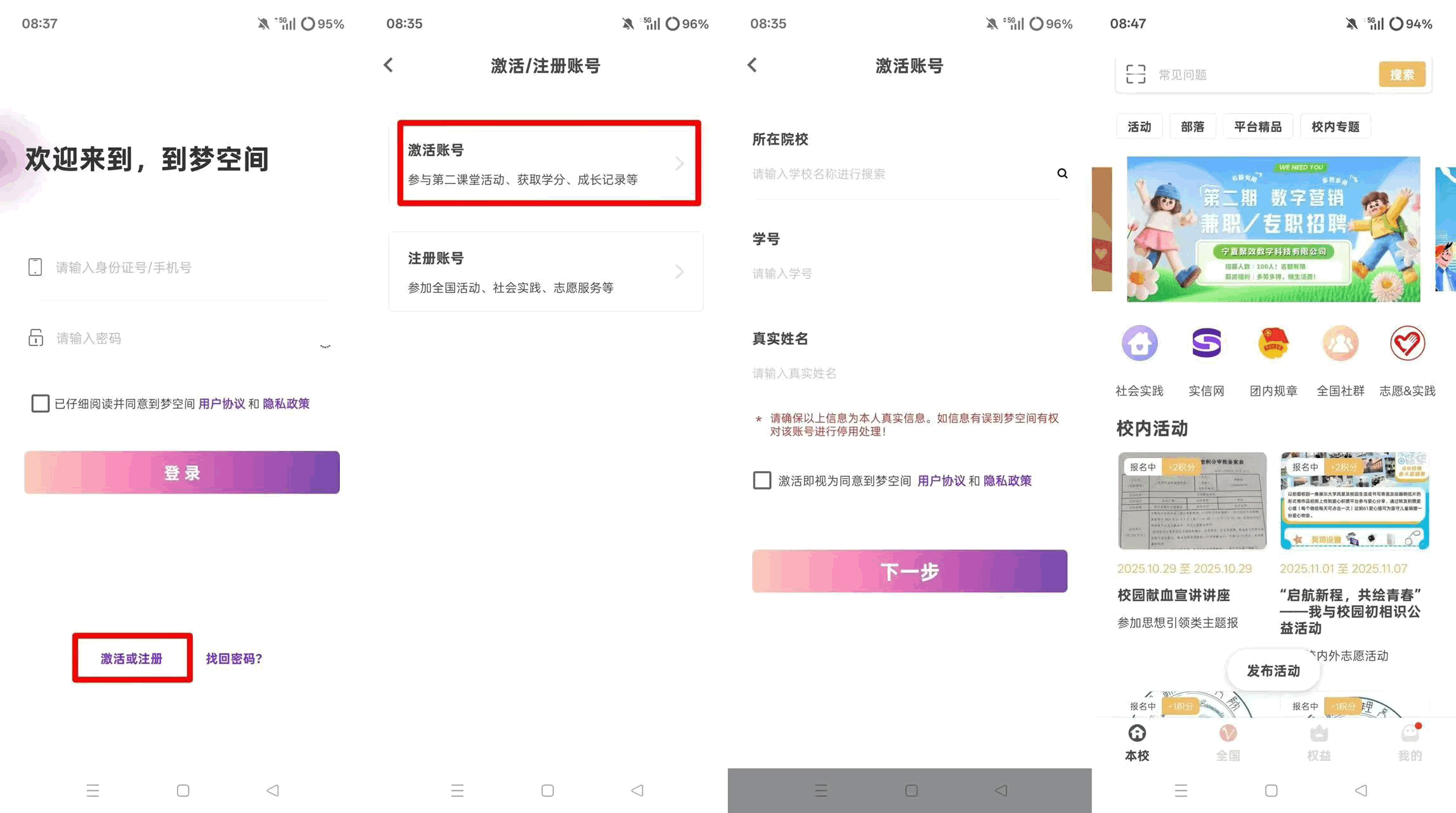 下载“到梦空间”APP后,进入登录界面,点击“激活或注册”,然后再点击“激活账号”,依次填写所在院校、学号和真实姓名,绑定手机号并设置密码,可暂不关联邮箱,立即激活。账号激活成功后,点击立即进入,直接登录到首页。