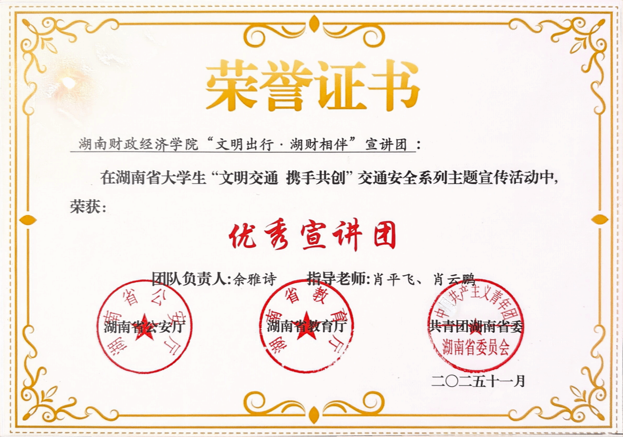 近日,从湖南省大学生“文明交通 携手共创”交通安全系列主题宣传活动组委会传来喜讯,best365官网“文明出行·湖财相伴”宣讲团凭借扎实的宣讲表现与优质的创作作品,一举斩获“优秀宣讲团”与“优秀作品奖”两项省级荣誉,这是校团委在志愿服务领域深耕细作的又一重要成果。