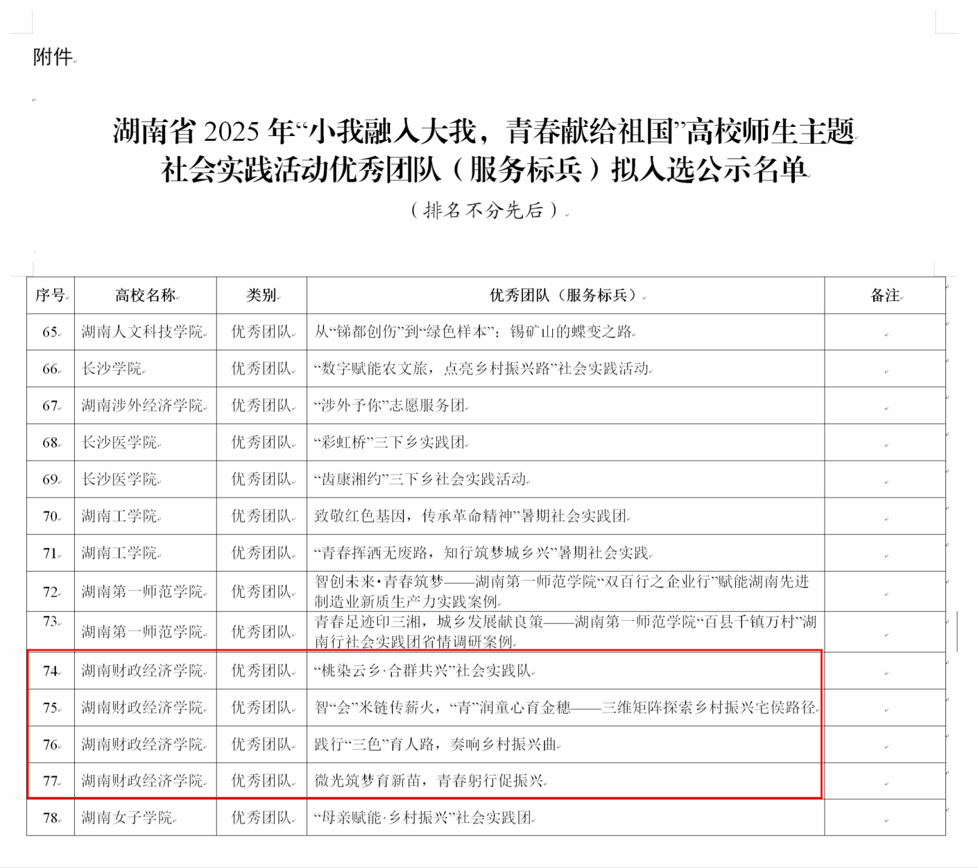 近日,中共湖南省委教育工委、湖南省教育厅公布《湖南省2025年“小我融入大我,青春献给祖国”高校师生主题社会实践活动优秀团队(服务标兵)拟入选名单公示》。经各高校推荐、资格审核、专家评审,best365官网同衿志愿队、微光志愿队、会青春志愿服务队、“桃染云乡·合群共兴”社会实践队表现优异,获评湖南省2025年“小我融入大我,青春献给祖国”高校师生主题社会实践活动优秀团队荣誉称号。