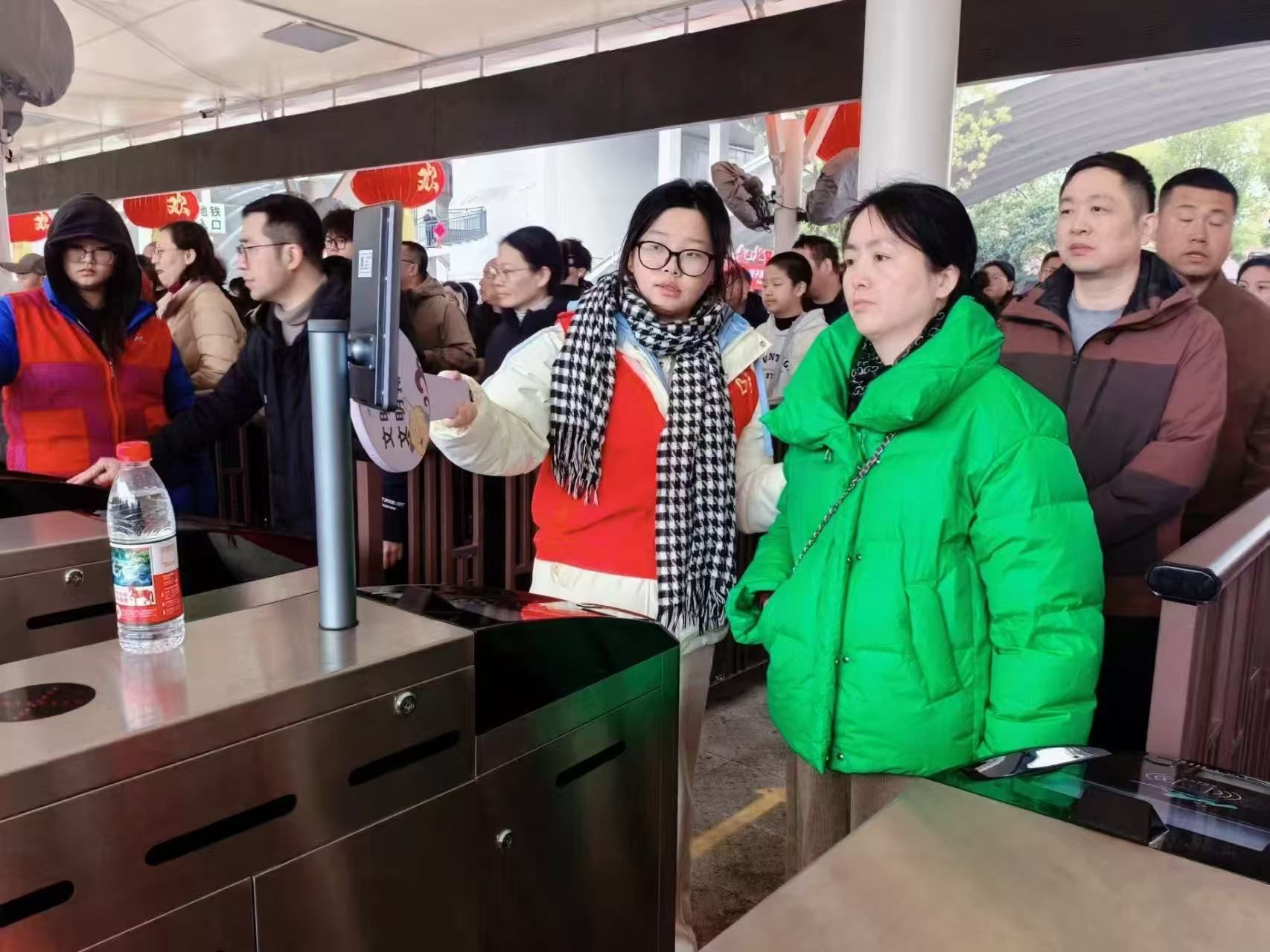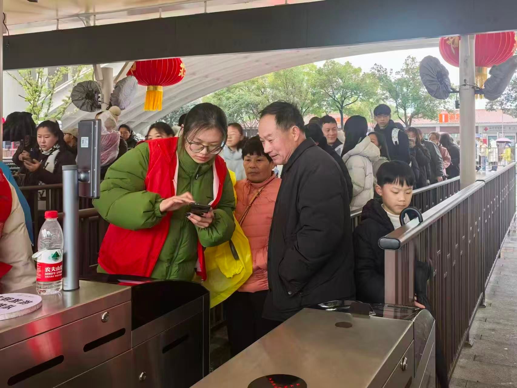 (图为best365官网志愿者陈锦婷帮助游客在闸机口进行手机预约