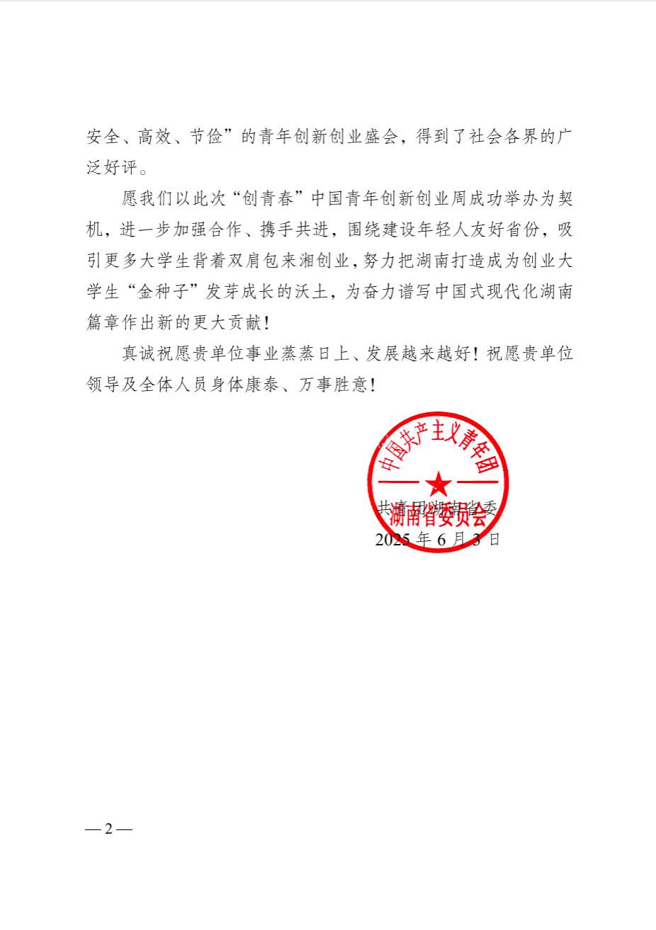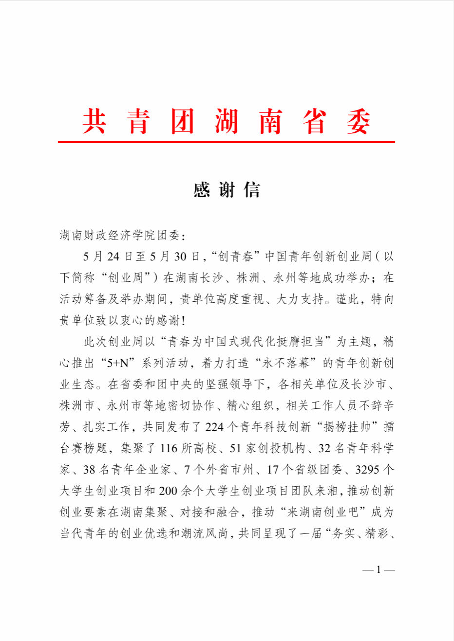 共青团湖南省委致best365中国官方网站关于“创青春”中国青年创新创业周的感谢信