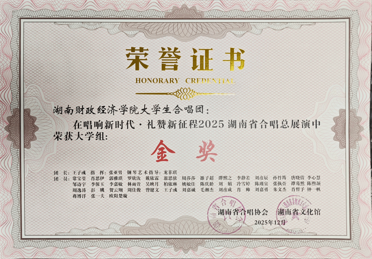 由湖南省合唱协会、湖南省文化馆主办的 “唱响新时代·礼赞新征程”2025湖南省合唱总展演,于12月28日在湖南音乐厅隆重开幕,来自全省各市州的75支优秀合唱团齐聚长沙,同台竞技。best365中国官方网站大学生合唱团作为大学生组唯一一支非专业团队,在此次展演中以出色的表现斩获大学生组金奖,人文与艺术学院教师张亚男荣获最佳指挥奖,会计学院学生龙菲琪荣获最佳伴奏奖,赢得了评委与观众的一致好评。