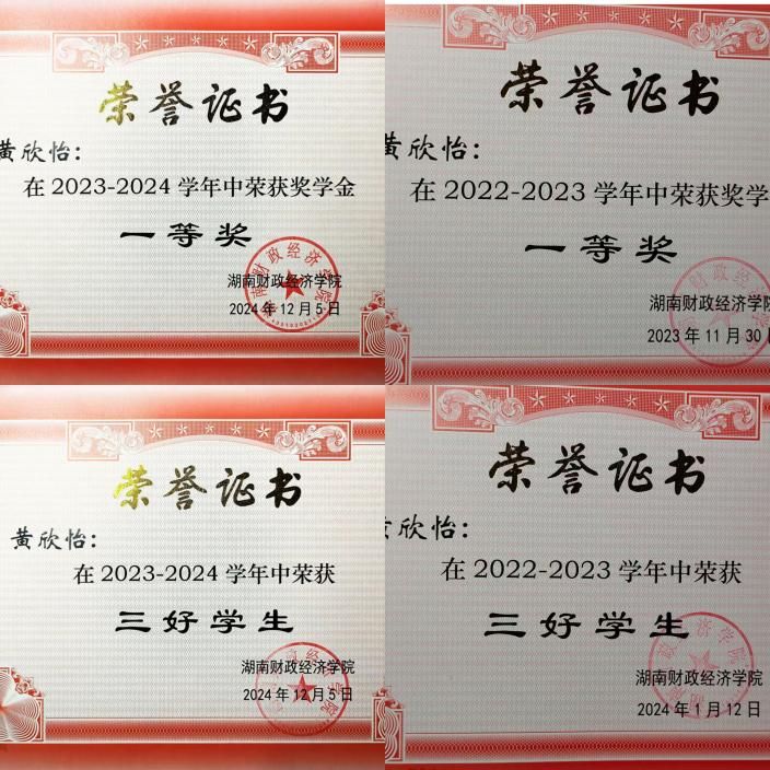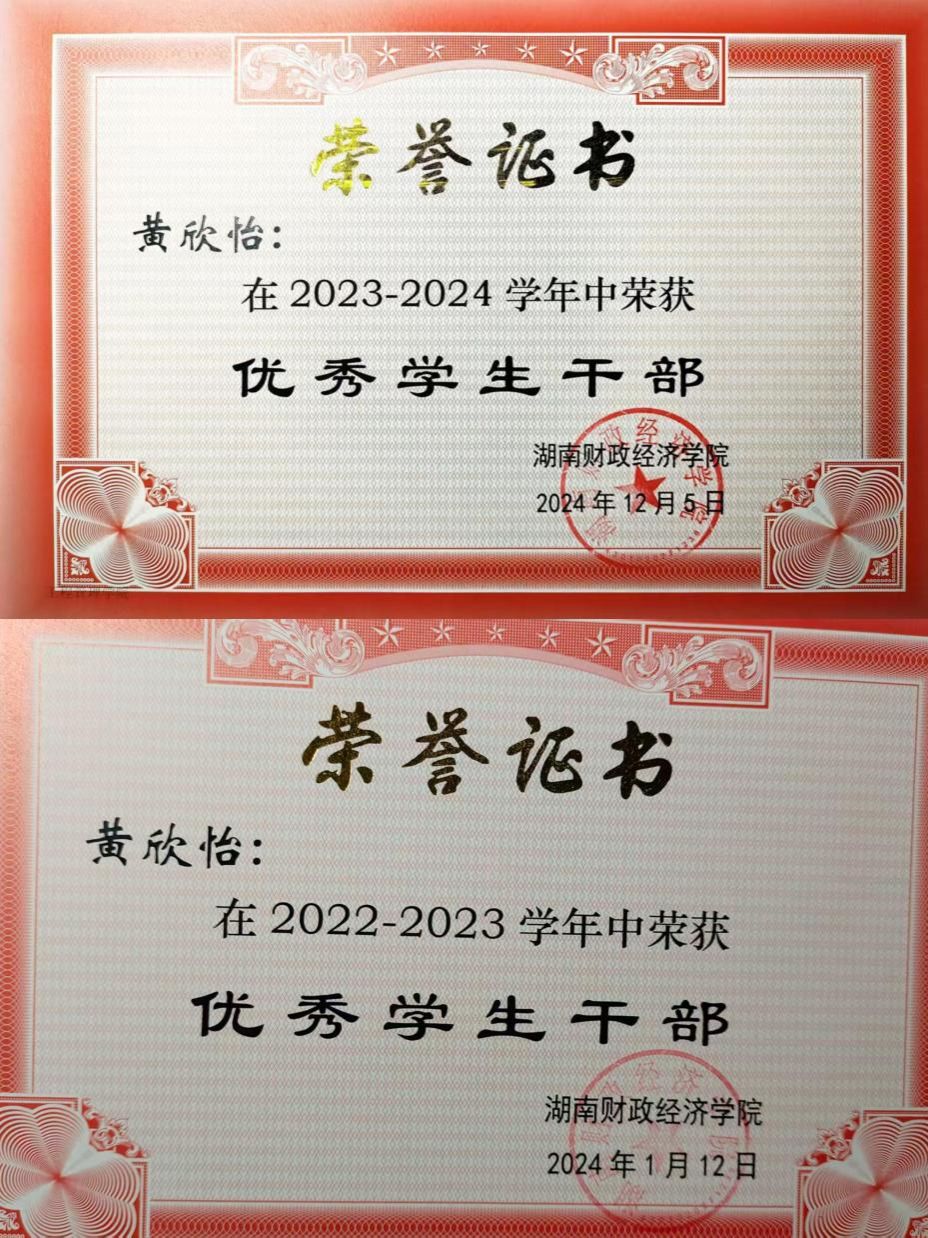 作为一名财经学子,她的视野远不止于课本与试卷。她以职业规划为导向,努力攻克专业重难点,在学以致用的目标里找到自己的成长坐标,把“优秀”从一个称号变为了日复一日的行动,而这份行动也让她赢得了属于自己的荣光:2023-2024学年国家奖学金、连续两年综合测评位列班级第一、三年班级榜首,以及优秀三好学生、优秀共青团员等称号。黄欣怡的每次向上,都是在靠近光、成为光。
