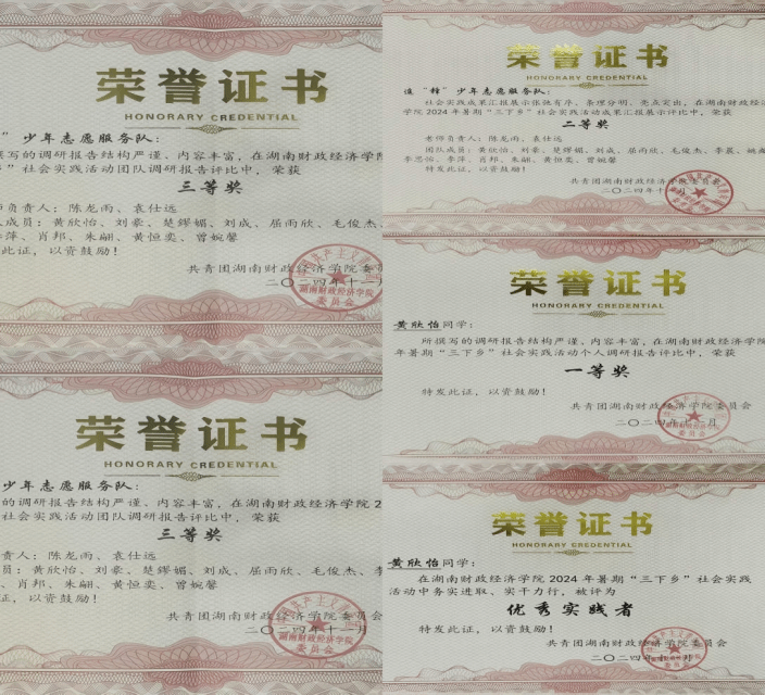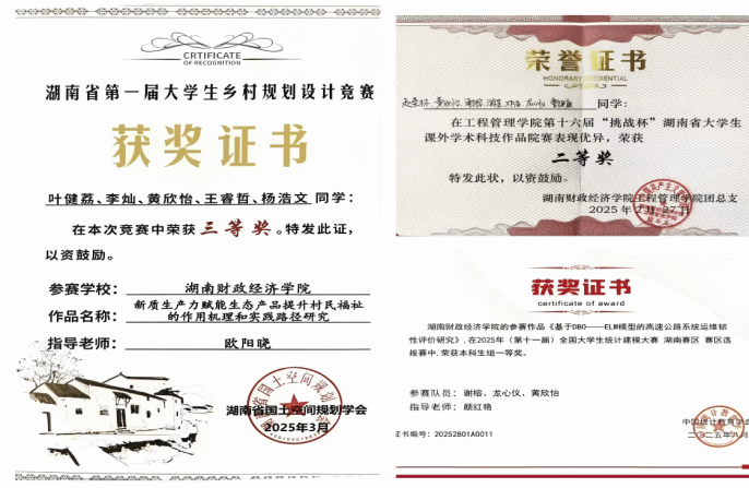 在学术竞赛方面,她同样光芒四射。乡村规划斩获省级立项、勇夺挑战杯荣誉勋章、获评优秀读书报告证书……用实力彰显湖财人的学术风采。技能认证领域,黄欣怡也全面开花:英语四六级顺利过关、普通话二级甲等达标。