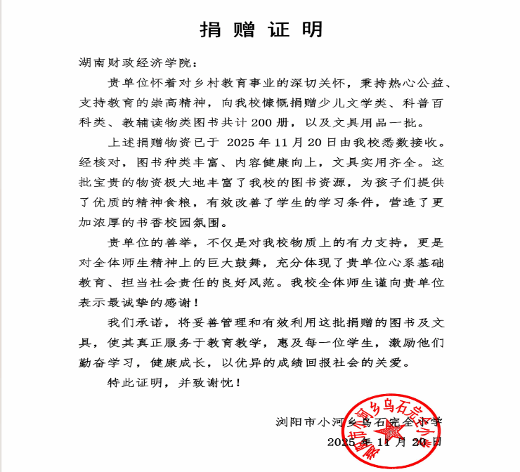 经过精心筹备,200册涵盖少儿文学、科普百科、教辅读物的优质图书及一批文具,于11月20日顺利送达浏阳市小河乡乌石完全小学。从物资清单确认到接收流程对接,活动团队与王志敏校长的每一次沟通,都为这份爱心的落地筑牢了根基。