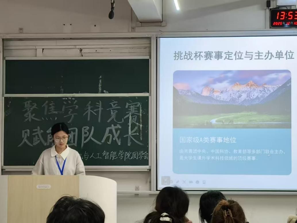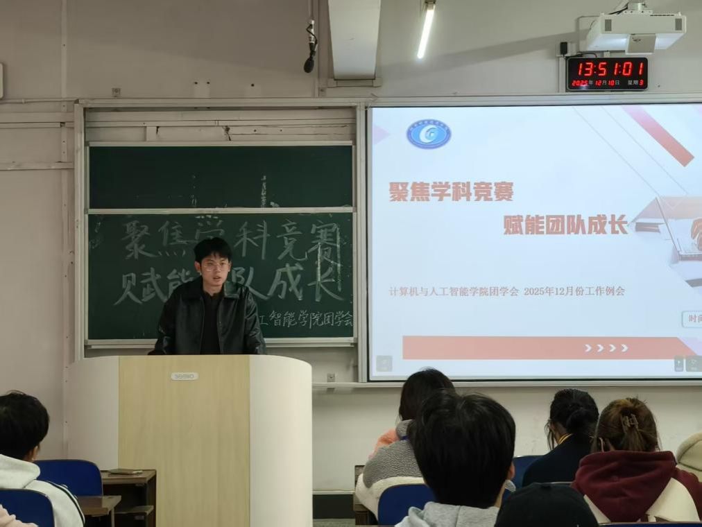 为充分发挥党员先锋模范作用,推动党建与人才培养深度融合,12月10日,计算机与人工智能学院在主校区第三教学楼3109教室举办第四期“党员先锋微论坛”。院团总支书记、党委兼职组织员李雨希以“党员先锋引领,竞赛赋能成长”为题作微党课分享,学院党员代表、全体团学会干部参加活动。