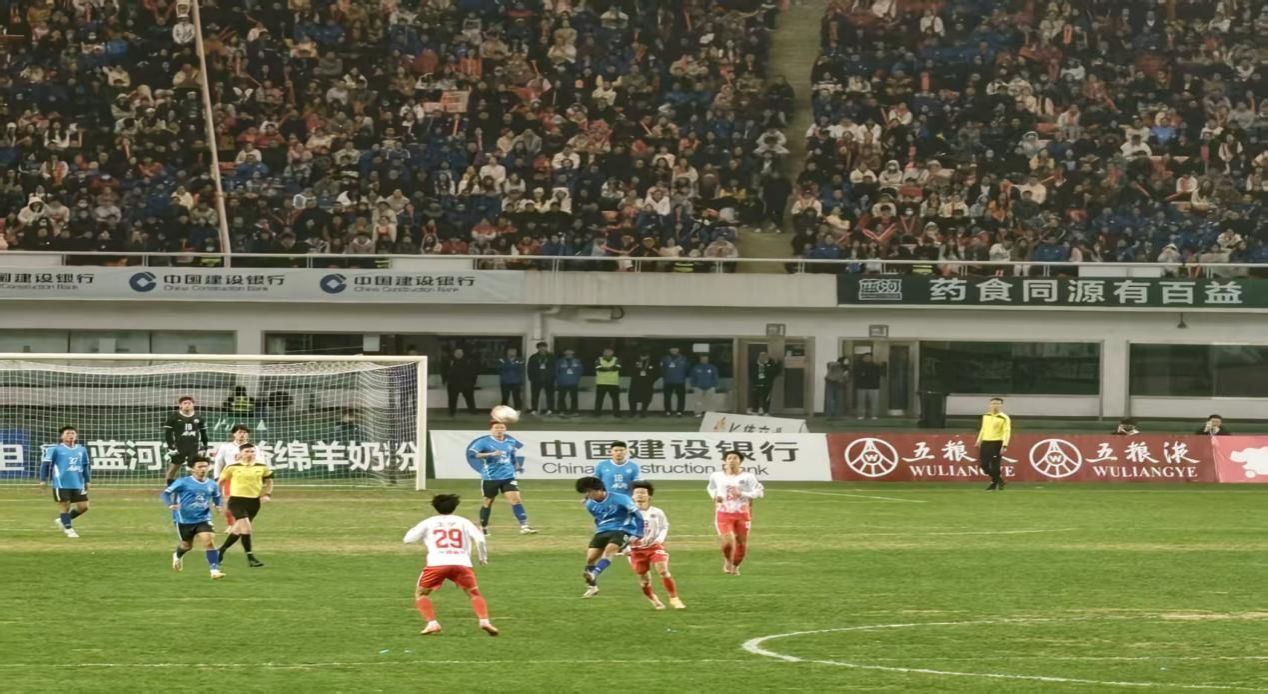90分钟的赛事全程高能,两队攻防切换行云流水,抢断、传球、射门一气呵成,比分交替攀升,热烈的竞技氛围让现场观众直呼过瘾。看台上,湖财体院助威团挥舞红色旗帜如星火燎原,整齐嘹亮的呐喊声穿透赛场,与球员们拼搏的身影交相辉映。从赛前整装奔赴赛场的昂扬姿态,到赛中全情投入的加油鼓劲,他们用最纯粹的热情诠释对本土足球的赤诚热爱,更展现了新时代体育人的责任与担当。