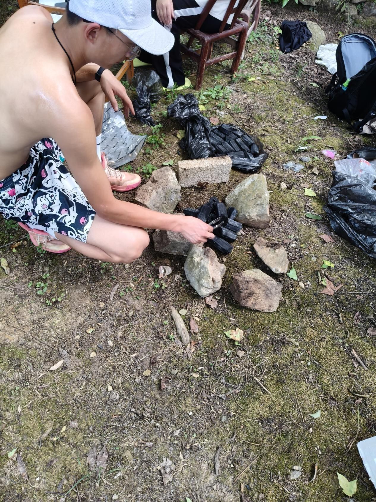 同学们在野外生炭