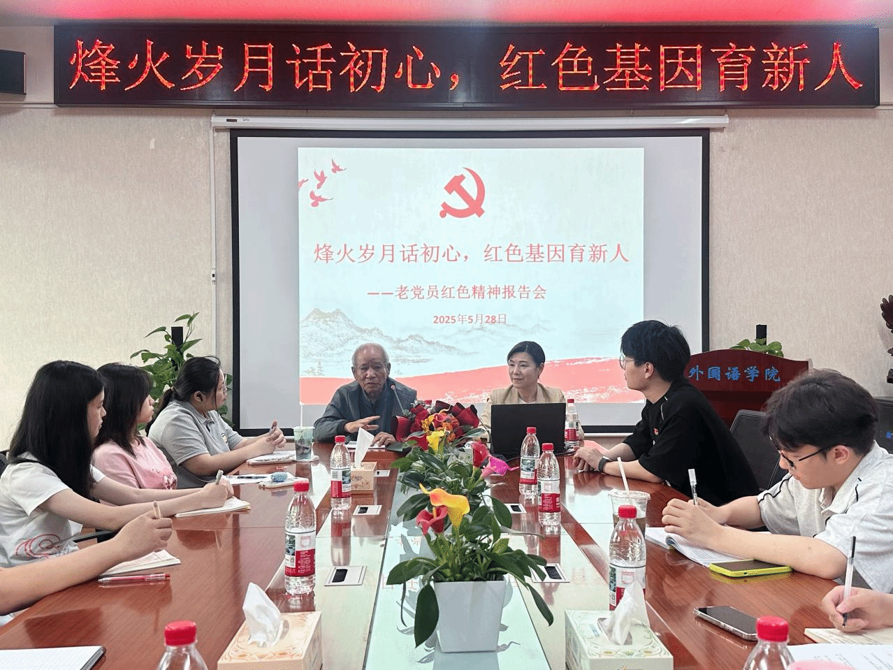 为进一步贯彻《best365中国官方网站关心下一代工作委员会2025年工作要点》文件精神,加强外国语学院学生思想道德教育,5月28日下午,在办公楼315室组织了一场以“烽火岁月话初心,红色基因育新人”为主题的老党员红色精神报告会。本次报告会特邀82岁的抗美援越战争老战士、老党员石磊主讲,外国语学院党委副书记张鹏、院学生第二党支部书记代承轩以及2025年上半年全体入党积极分子一同参加。会议由代承轩主持。
