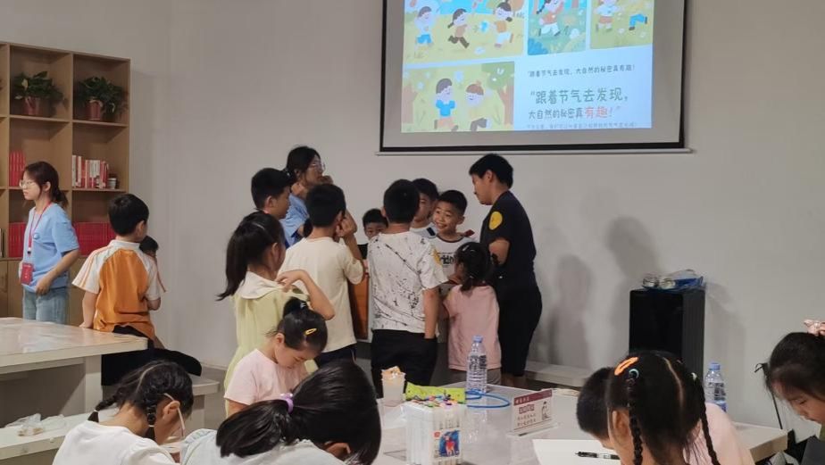 在课堂与自然的相互交织中,二十四节气小课堂以“春分立蛋原理”“清明插柳寓意”等问题为切入点,引导孩子们在观察与思考中探索节气奥秘,解锁古代劳动人民智慧的结晶。孩子们围坐成圈,目不转睛地看着志愿者操作讲解,不时举手提问。当看到鸡蛋真的在桌面上立起来时,不禁惊呼:“原来古人这么厉害!”课堂尾声,孩子们跟着志愿者齐声背诵二十四节气歌,稚嫩的声音在课堂回荡。
