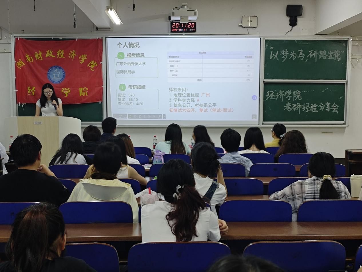 为助力学生深入洞悉考研政策、明确学习路径,并科学规划复习策略,经济学院于5月15日晚上19:00在3108成功举办了“以梦为马、研路生花”考研经验分享会。本次分享会特邀我院21级优秀考研上岸学生分享考研经验,参加本次分享会的有经济学院院长李勇辉、院党委副书记刘英、学工办负责人谢龙、26届辅导员王竹青以及22、23级意向考研的同学。