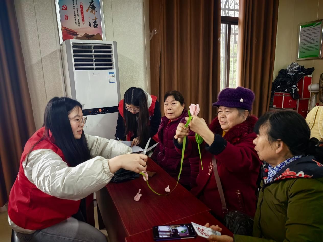 手工传递爱与情。为迎接“三八”国际劳动妇女节,望新社区与学院直属党支部共同组织长者郁金香手工制作活动,以手工为媒介,关爱社区空巢、高龄长者。活动现场,志愿者们穿梭于手工桌间,积极协助遇到困惑的老人,帮助他们顺利完成作品,鼓励他们展现自我、肯定自我。