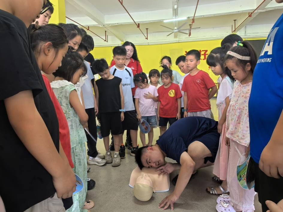 在防溺水安全教育环节,浏阳市永安镇人民政府退役军人服务站站长何伟结合典型案例,深刻阐述了增强防溺水意识的重要性。通过剖析多起因防溺水意识不足导致的悲剧,让学生们直观认识到溺水危害的严重性。浏阳市泰平人防救援队队长唐松明在活动中播放了模拟溺水及不当救援后果的视频,使学生沉浸式感受溺水场景及错误救援的危险性,进一步强化了学生对掌握防溺水知识重要性的理解。此外,救援人员利用假人模型,现场示范溺水者上岸后的施救方法,讲解并演示心肺复苏的正确操作步骤,让学生们掌握基本的急救技能。