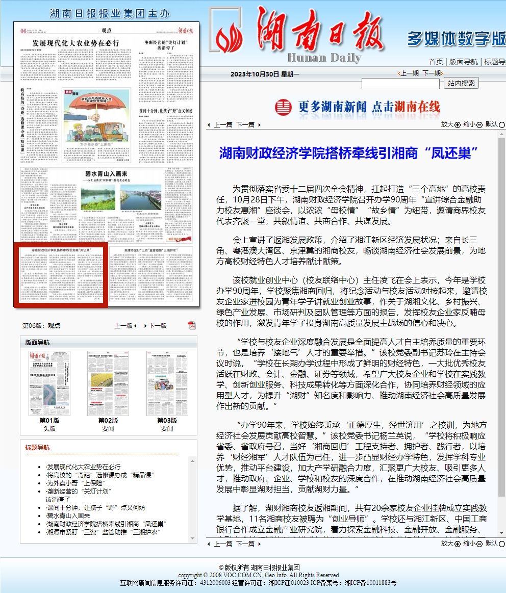 据了解,湖财湘商校友返湘期间,共有20余家校友企业挂牌成立实践教学基地,11名湘商校友被聘为“创业导师”。学校还与湘江新区、中国工商银行合作成立金融产业研究院,着力探索金融科技、金融开放、金融服务、金融安全等领域的制度模式与体制创新,为校友企业提供人才、技术等方面支持。(何 妍)