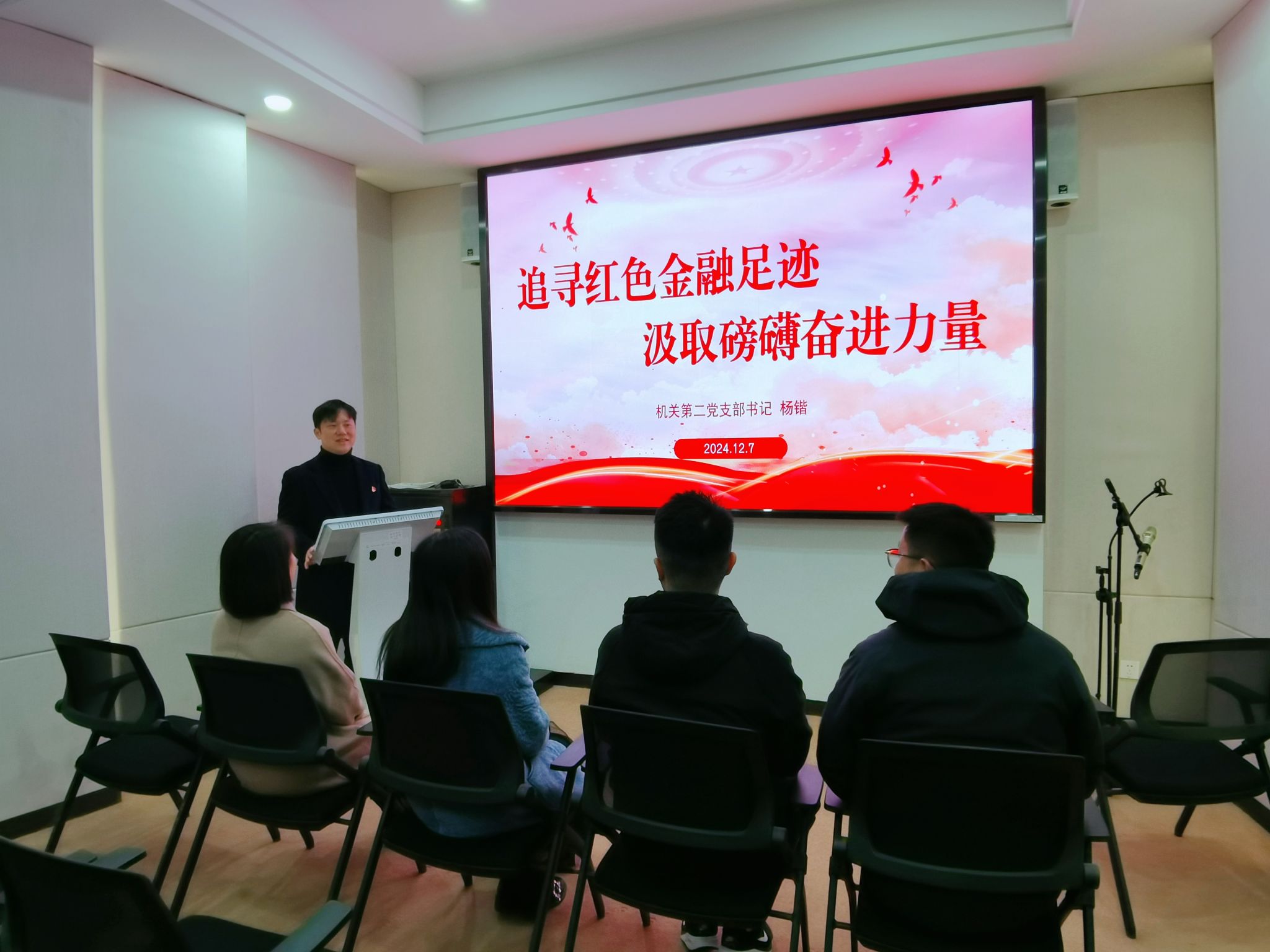 参观过程中,支部全体党员还观看了由马克思主义学院拍摄制作的微党课视频《从“扁担银行”到“金融强国”——读懂中国特色金融发展之路的成功密码》。机关第二党支部书记杨锴为支部全体党员作了以“追寻红色金融足迹 汲取磅礴奋进力量”为主题的党课分享,生动再现了中国共产党领导下的红色金融发展历程,从中共苏维埃国家银行(中国人民银行前身)的艰难起步,到统一货币的改革发展,再到历史性的金融创新举措,红色金融史奠定了中国解放战争的坚实基础,也见证了中国共产党人不懈奋斗、勇于担当的光辉历程。